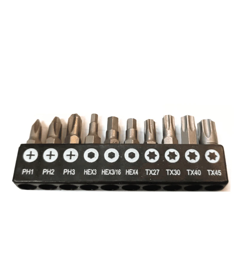 Incluye: PH1, PH2, PH3, HEX3, HEX3/16, HEX4, TX27, TX30, TX40,TX45